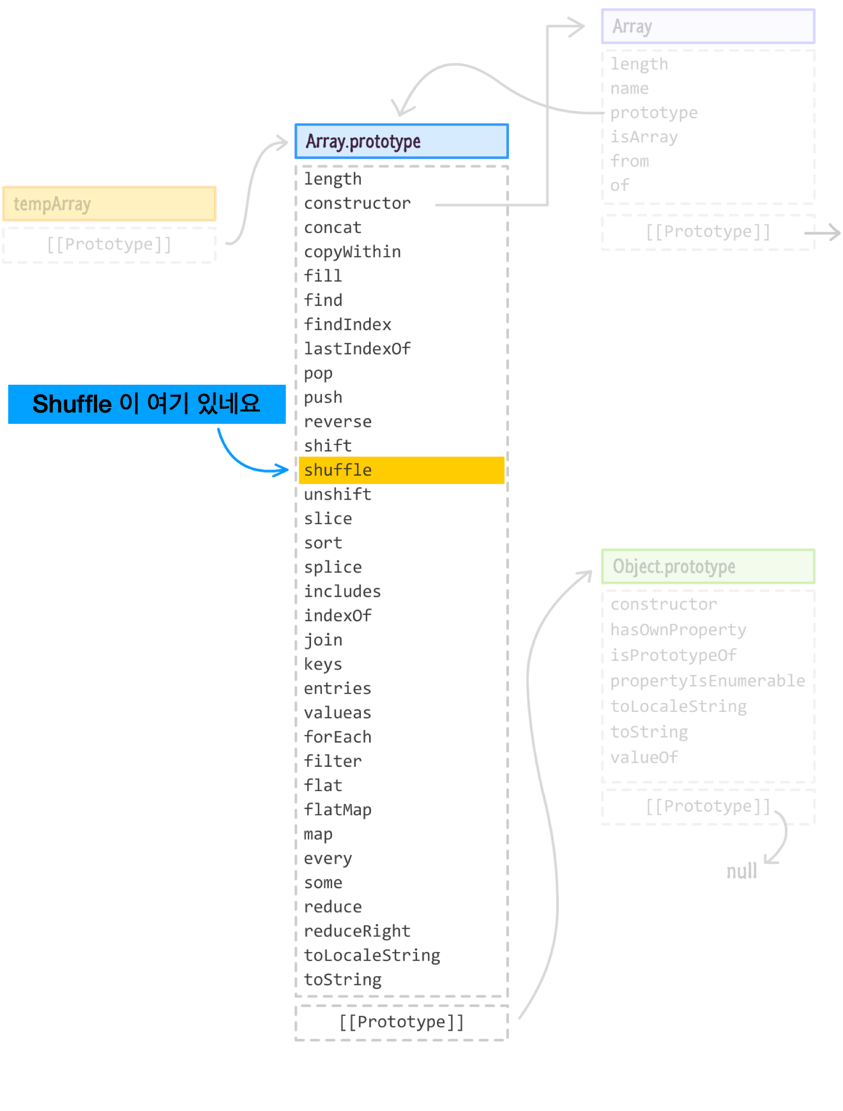 이 코드를 실행하면 shuffle 함수는 Array 객체가 Array.prototype을 통해 노출하는 다른 모든 내장 메서드와 함께 액세스 가능하다는 겁니다.