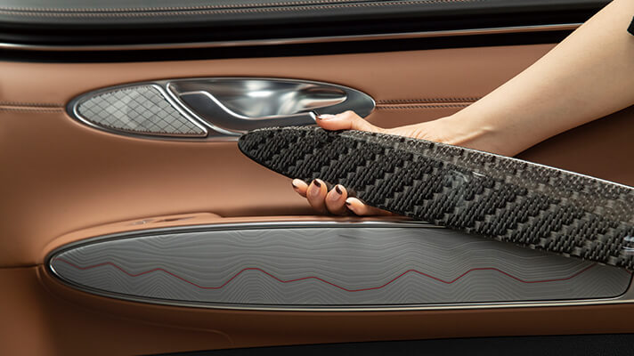 GV70 스포츠 패키지 전용 가니쉬는 카본 조직 본연의 입체감과 볼륨감을 강조해 역동적인 분위기를 연출합니다.