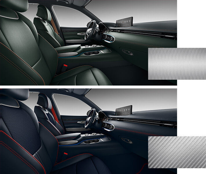 GV70은 총 여섯 가지의 인테리어 가니쉬(Garnish, 차량 실내에 적용된 내장재)를 제공합니다.