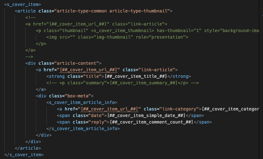 커버 목록은 기본적으로 제목, 요약글, 그림 썸네일 이렇게 표시되는데 저는 위 그림처럼 깔끔하게 보이기 위해 요약글과 썸네일이 보이는 코드는 주석처리했습니다.