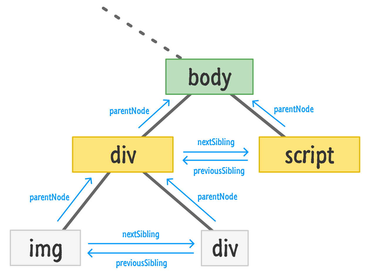 이에 대한 관련 속성은 parentNode, previousSibling 및 nextSibling입니다.