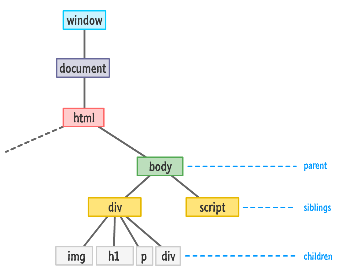 script 요소에는 자식이 없지만 div 요소에는 자식이 있습니다. img, h1, p 및 div는 div 요소의 자식이며 동일한 부모의 형제입니다.
