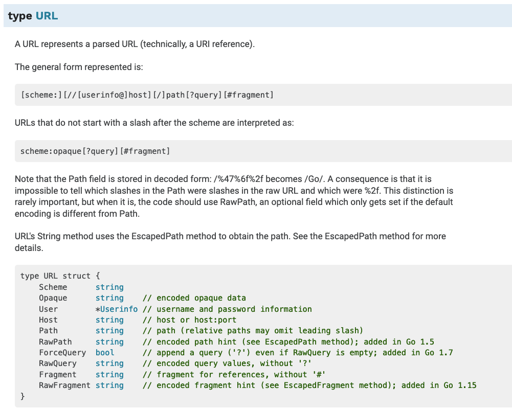 Scheme, Opaque, User, Host, Path, RawPath, ForceQuery, RawQuery, Fragment, RawFragment가 있습니다.