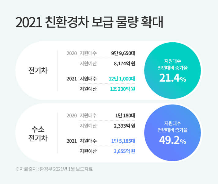 정부는 새롭게 개편된 2021년 친환경차 보조금을 통해 “친환경차의 대중화와 수송 부문 탄소 중립을 조기에 달성할 계획”이라며, “향후에도 시장 상황 및 수요변화에 적극 대응해 보조금 제도를 운용해 나갈 계획”이라고 밝혔다.