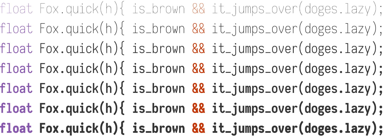 The three quasi-proportional families: Iosevka Aile, Iosevka Etoile, and Iosevka Sparkle, are designed targeting documentation preparation and writing. They provide more variety on character widths, including a slightly wider letter w and m, and narro