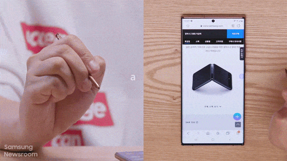 갤럭시 노트10 시리즈부터 탑재된 ‘에어 액션’을 통해 S펜 버튼을 누르고, 움직이는 것만으로도 다양한 앱을 제어할 수 있게 된 것.