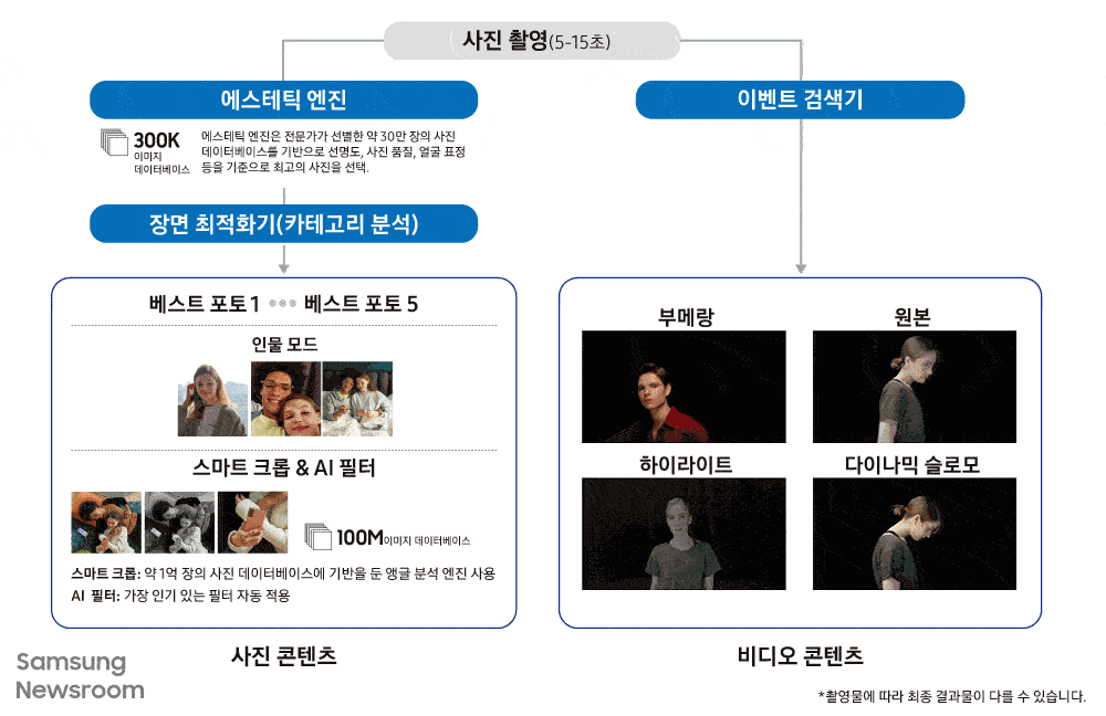 먼저 에스테틱 엔진(Aesthetic engine)은 전문가가 선별한 약 30만 장의 사진을 학습해 사진의 선명도와 사진 품질, 얼굴 표정 등 사진의 심미성을 평가한다.