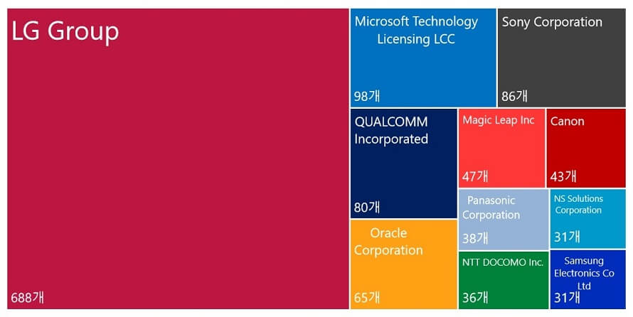 독일의 지적재산권 시장조사업체 아이플리틱스(IPlytics)가 최근 발표한 ‘확장현실 기술 특허 보고서’에 따르면 LG는 총 688건의 특허를 보유해 압도적인 차이로 1등을 차지했습니다.