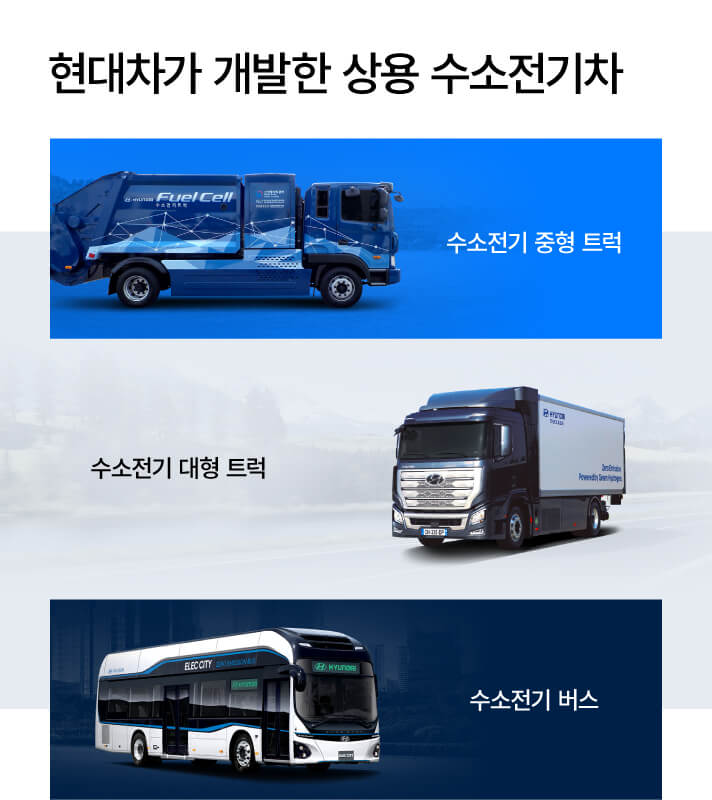 현대차는 수소 사회로의 진입을 가속화하기 위해 승용 수소전기차에 이어 상용 수소전기차 개발에도 박차를 가해 수소전기 버스, 수소전기 트럭도 양산에 성공했습니다.