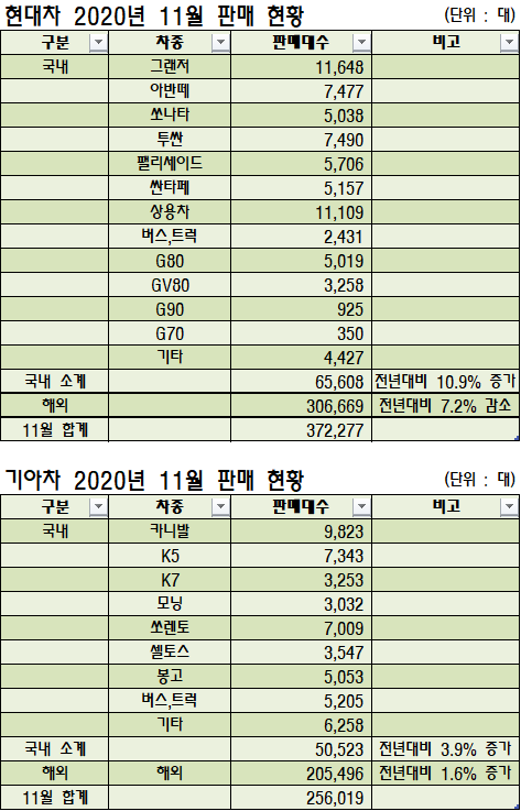 올해(2020년) 11월 판매 실적이 나왔습니다.