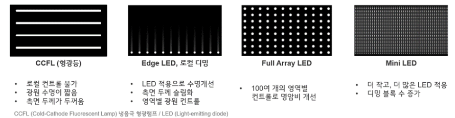당초 LCD TV는 형광등 형태의 CCFL(냉음극 형광램프, Cold Cathode Fluorescent Lamp)을 광원으로 사용했습니다.