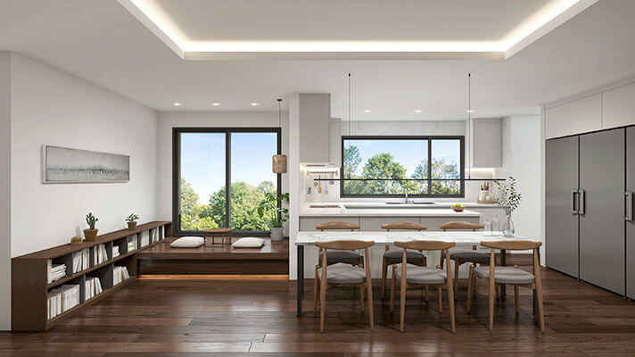 ‘힐링 프리미엄’ 공간을 함께 적용하면 대형 창과 더불어 단차를 활용해 주방에서도 간단한 티타임을 즐길 수 있습니다.