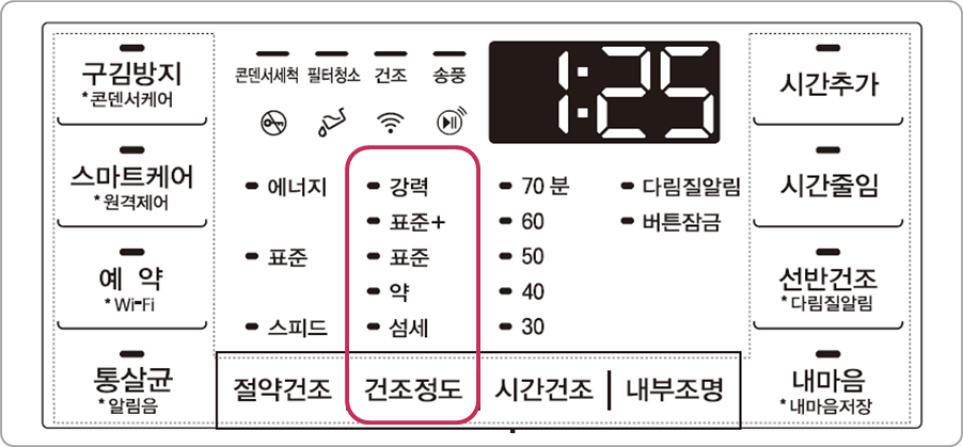 이럴 때 ‘건조 정도’ 기능 중 ‘강력, 표준+’ 옵션을 사용해 옷감의 수분 함량(건조 정도)을 더 줄일 수 있는데요.