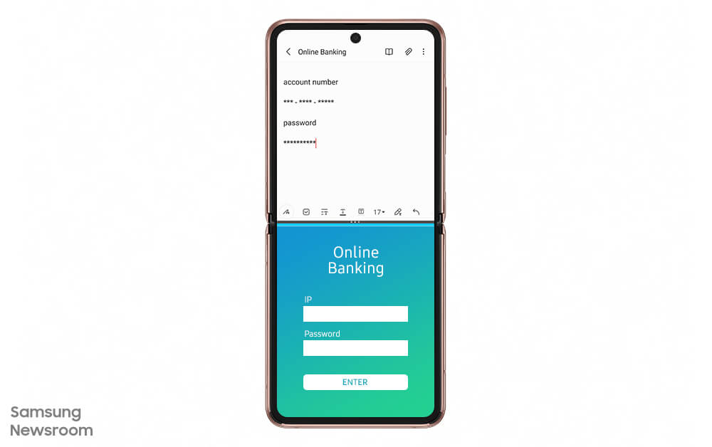 이럴 때 갤럭시 폴더블 폰 사용자들은 화면을 분할한 뒤, 위 화면에는 계좌 정보를 받은 메신저를 띄우고 아래 화면에서 모바일 뱅킹을 실행하면 된다.