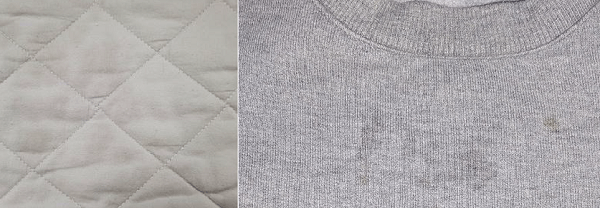 실생활에서 자주 사용하는 화장품 성분, 식용유(소스) 및 세제나 비누 성분이 세탁할 때 완전히 제거되지 않아 건조 후에 얼룩 형태로 옷감에 남아있을수 있습니다.