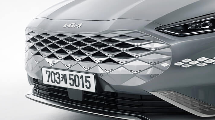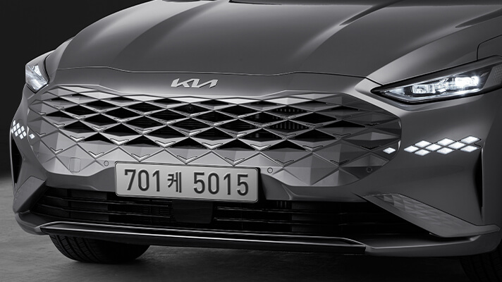 반면, K8의 전면부에서는 라디에이터 그릴을 과감하게 키우고 독창적인 비례와 형태로 존재감을 강조했다.
