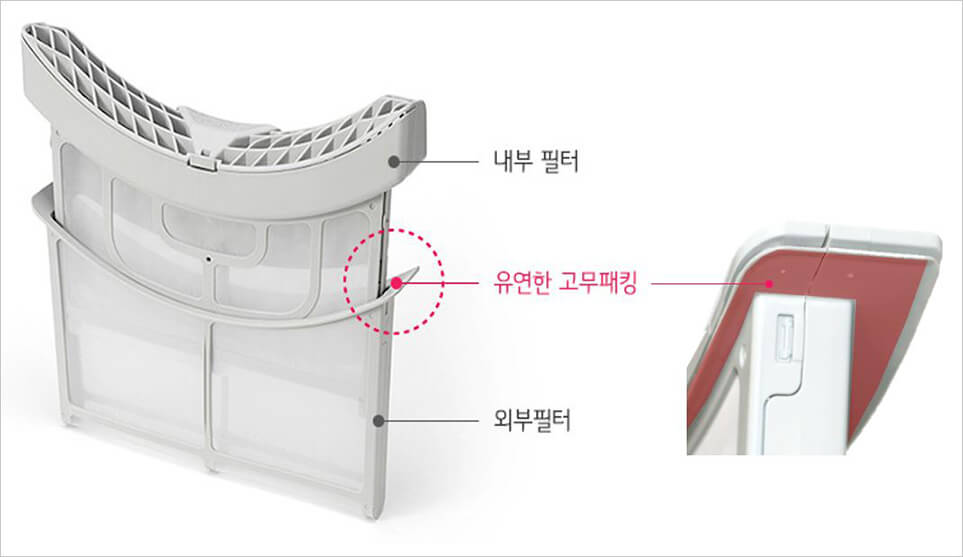 내부와 외부 필터로 구성된 건조기 필터는 건조 성능을 유지하기 위해 주기적인 필터 관리가 필요합니다.