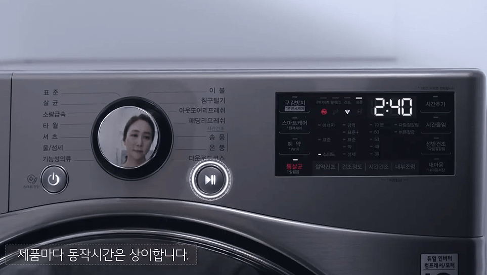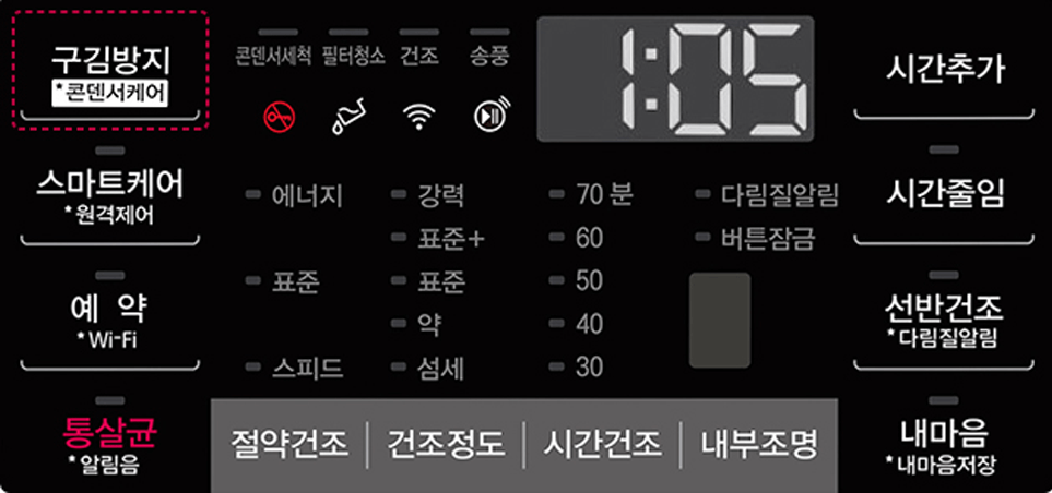 * 모든 건조 코스에서 콘덴서 자동세척 시스템 동작 (단, 건조 코스가 아닌 침구털기 코스, 송풍 코스 등은 이후 젖은 옷감으로 건조 행정 시 콘덴서 자동세척 진행)