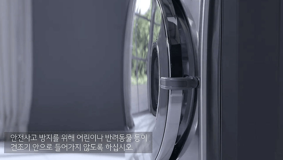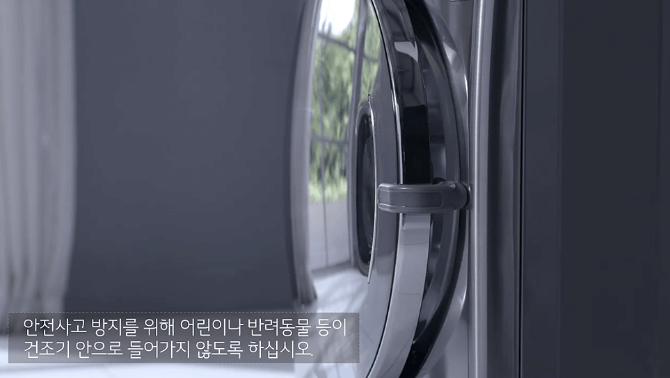 안전사고 방지를 위해 어린이나 반려동물 등이 건조기 안으로 들어가지 않도록 하는 것도 잊지 말아 주세요.