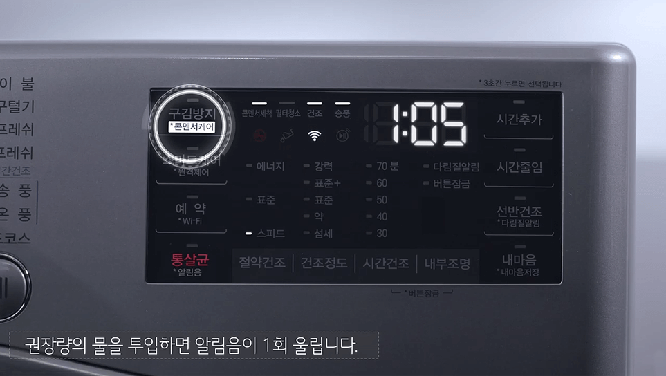 ⑤ 전원 버튼을 누르고 구김방지 버튼을 약 3초간 눌러 콘덴서 케어를 선택하세요.