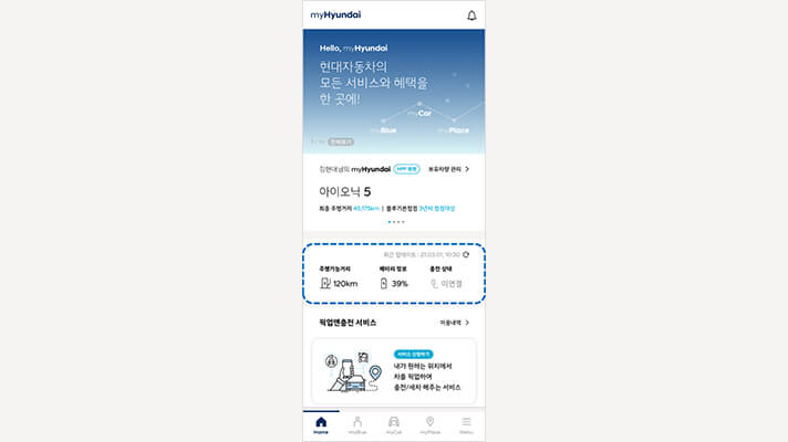 마이현대는 한눈에 전기차 상태를 파악할 수 있는 것은 물론 충전소를 직접 찾지 않고도 픽업 서비스로 간편하게 전기차를 충전하는 서비스 등을 이용할 수 있다.
