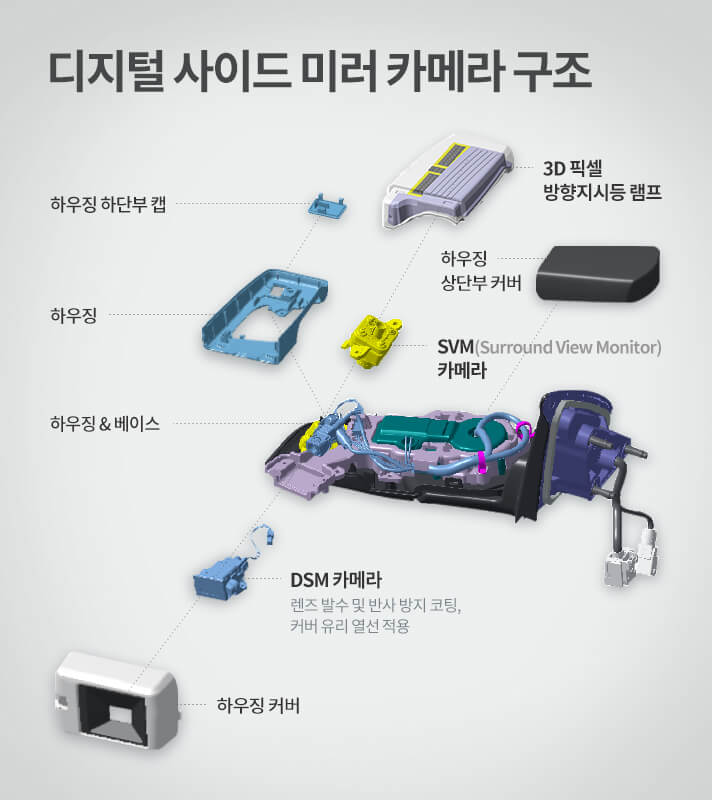 디지털 사이드 미러는 3D 픽셀 방향지시등, 서라운드 뷰 모니터용 카메라, 디지털 사이드 미러 카메라 등 복잡한 부품이 다양하게 적용 됐음에도 부피를 최소화했다.