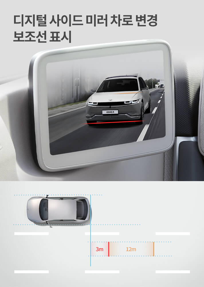 덕분에 아이오닉 5는 디지털 사이드 미러가 작동하지 않는 긴급 상황에서도 차로 변경 시 디지털 계기판을 통해 후방 화면을 보여주는 블라인드 뷰 모니터(BVM) 기능을 지속적으로 제공한다.