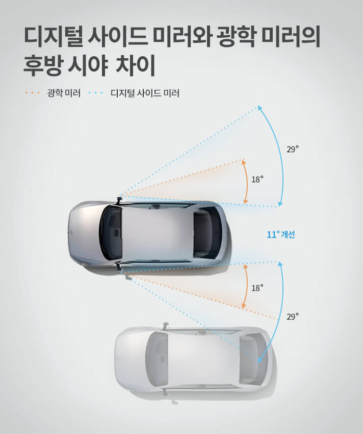 사이드 미러의 후방 시야각은 운전석 기준 약 18°이지만, 디지털 사이드 미러는 그보다 11° 넓은 약 29°의 시야각을 제공한다(기존 미러는 운전석 또는 조수석 및 운전자 위치별로 시야각이 상이).