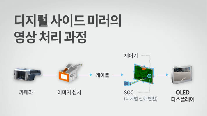 디지털 사이드 미러는 고화질 카메라로 후방을 촬영해 얻은 아날로그 신호 영상을 이미지 센서와 SOC를 거쳐 디지털 신호로 처리한 뒤 실내에 배치된 모니터로 전달한다.
