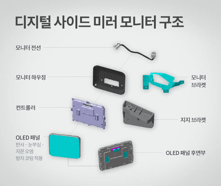 디지털 사이드 미러의 카메라로 찍은 영상을 실내에서 확인할 수 있도록 해주는 좌우측의 모니터 한 쌍은 크게 OLED 패널, 컨트롤러, 전선, 각종 브라켓, 하우징으로 구성된다.