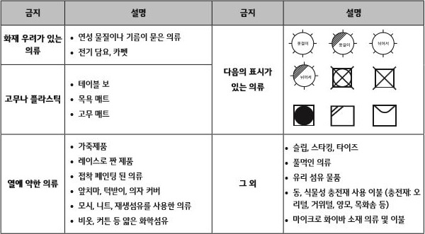 - 아래의 의류는 제품에서 절대 건조하지 마십시오. 화재 및 수축, 변형, 변색이 될 수 있습니다.