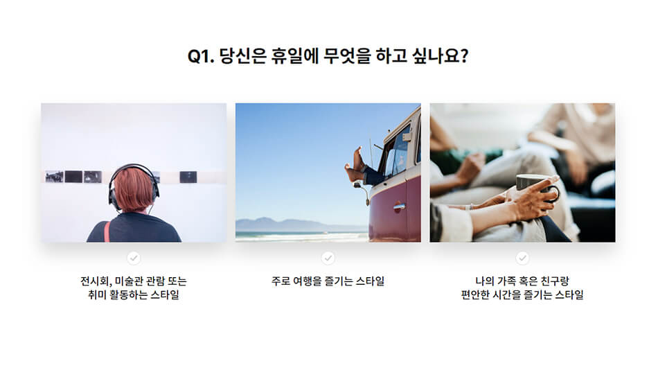 LG 오브제컬렉션 홈페이지의 ‘체험’ 메뉴에서는, 몇 가지 질문을 통해 소비자의 취향과 라이프스타일을 파악하고 그에 어울리는 가전 스타일을 추천해 줍니다.