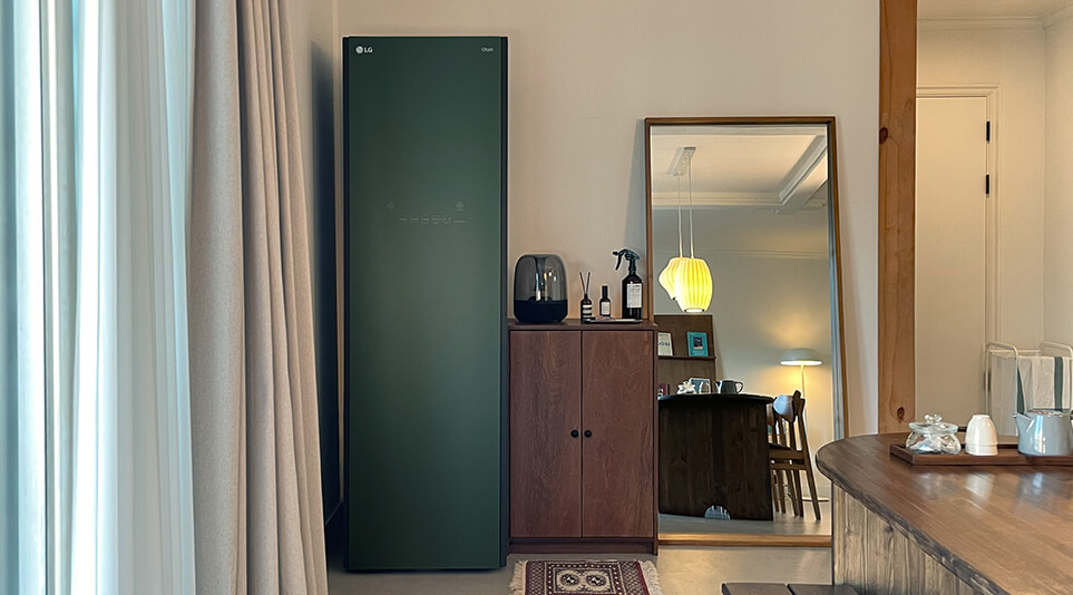 ‘LG 오브제컬렉션 스타일러’는 공간과 자연스럽게 조화될 수 있도록 베이지 및 그린 컬러로구성되어 있습니다.