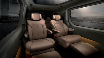 9인승 라운지 모델에는 실내에서 다양한 커뮤니케이션 활동이 가능하도록 2열에 앞뒤로 180° 회전하는 스위블(Swivel) 기능을 추가했다.