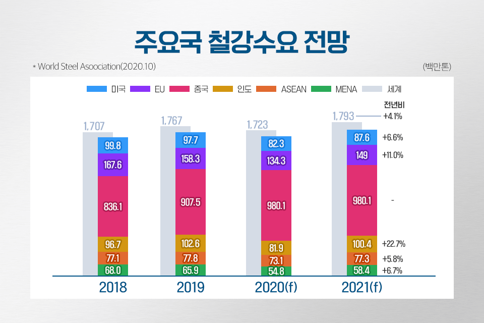 올해 세계 철강수요는 백신 보급에 따른 코로나19 확산 진정, 경기부양책 효과, 수요산업 활동의 본격 재개로 4.1%성정할 것으로 전망된다.
