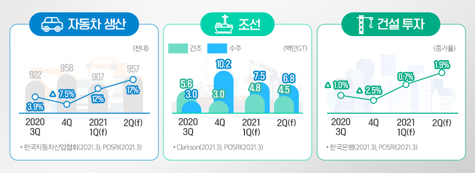 조선은 건조량은 전분기 대비 소폭 감소 전망이나, 물동량 회복과 친환경 선박 발주 증가 기대되며, 건설투자는 경기부양에 따른 공공투자 확대와 재건축 등 민간 양호로 완만한 회복세를 나타낼 것으로 보인다.