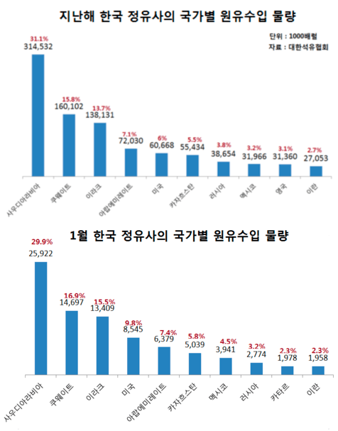 우리나라는 전체 원유 수입량이 28.5%에 달하는 약 3억 2천만 배럴을 사우디에서 수입하고 있습니다.