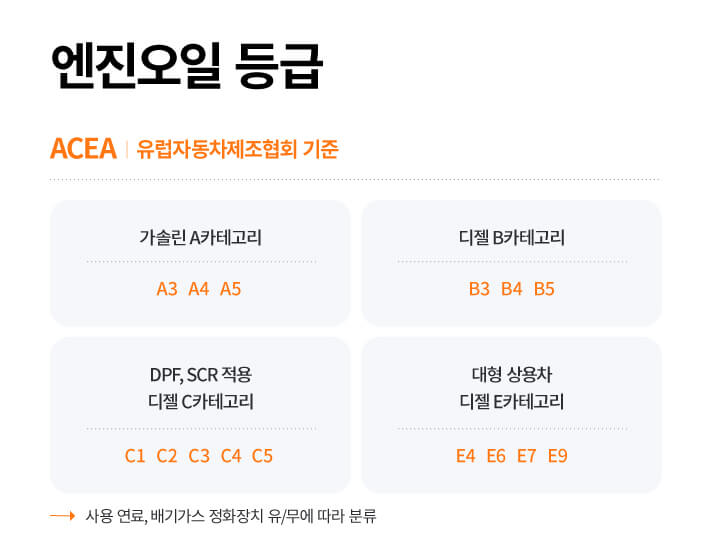 ACEA 규격에서는 배기가스 후처리 장치가 없는 가솔린 엔진용 A카테고리 <A3 / A4 / A5>와 배기가스 후처리 장치가 없는 디젤 엔진용 B카테고리 <B3 / B4 / B5>,