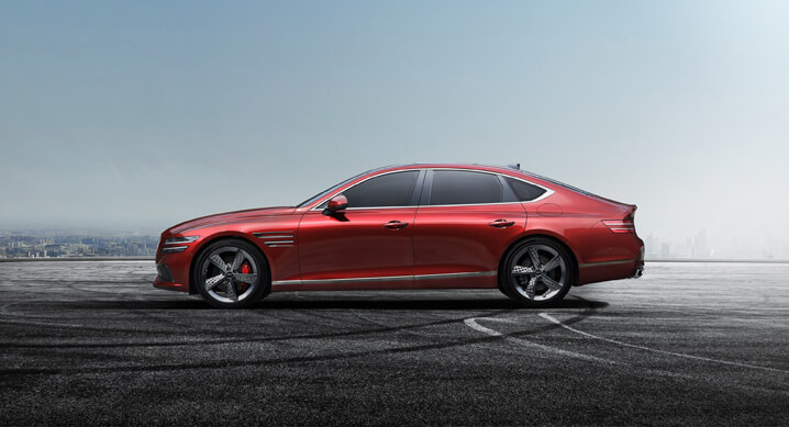 측면부 역시 다크 유광 크롬으로 마감한 사이드 몰딩과 지-매트릭스 패턴의 스포츠 전용 20인치 다크 스퍼터링 알로이 휠, 엔진 사양에 맞춰 적용되는 레드 혹은 블랙 색상의 캘리퍼가 G80 스포츠만의 존재감을 드러낸다.