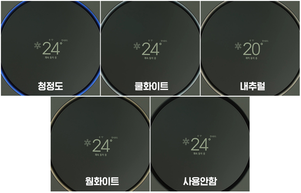 리모컨의 좌/우 버튼을 활용해 가장 기본적인 ‘청정도’부터 ‘쿨화이트’, ‘내추럴’, ‘웜화이트’의 순서대로 변경할 수 있습니다.