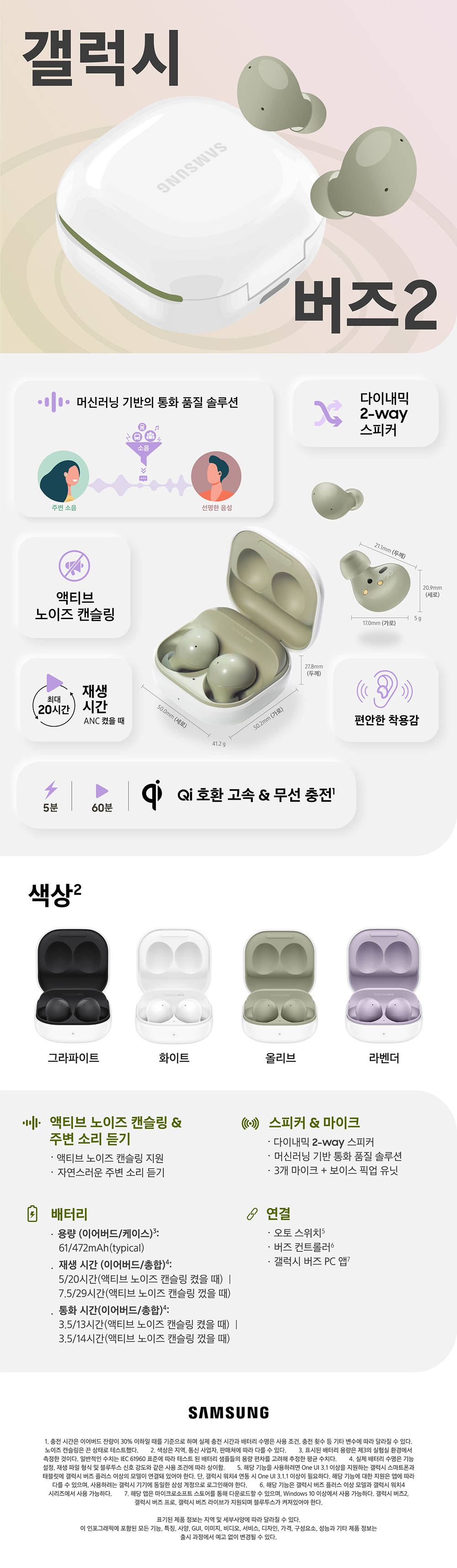 가볍고 컴팩트한 디자인에 네 가지 컬러를 입은 갤럭시 버즈2의 자세한 스펙을 아래 인포그래픽에서 만나보자.