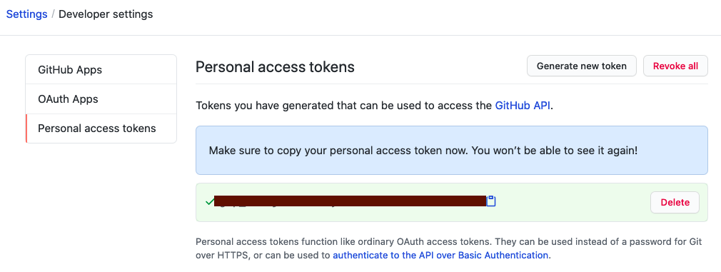 이제 토큰을 만들었으니 잘 저장하셔서 기존에 password 대신 이 토큰을 복사하셔서 넣으시면 됩니다.