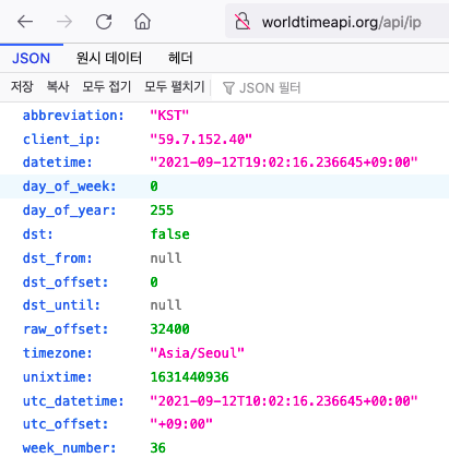 {"abbreviation":"KST","client_ip":"59.7.152.40","datetime":"2021-09-12T19:02:22.254943+09:00","day_of_week":0,"day_of_year":255,"dst":false,"dst_from":null,"dst_offset":0,"dst_until":null,"raw_offset":32400,"timezone":"Asia/Seoul","unixtime":1631440942,"utc_datetime":"2021-09-12T10:02:22.254943+00:00","utc_offset":"+09:00","week_number":36}