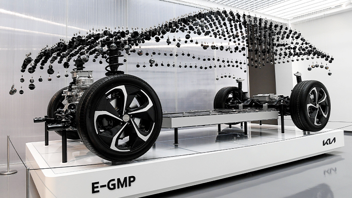 EV6 인사이드 존은 EV6 기술력의 근간인 전기차 전용 플랫폼 ‘E-GMP(Electric-Global Modular Platform)’를 활용한 전시물로 채웠다.
