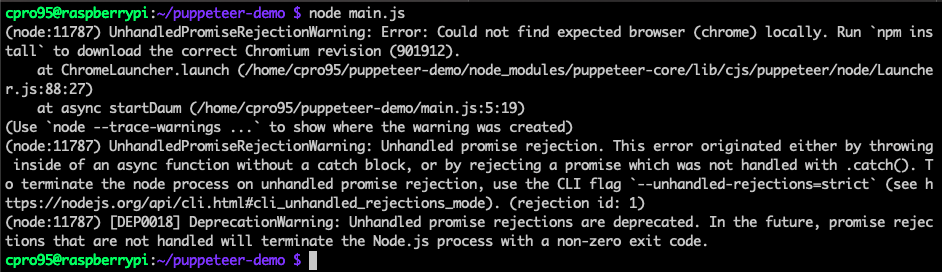 라즈베리파이에서 puppeteer를 실행해 보면 아래 스크린샷처럼 chrome이 없다고 나옵니다.
