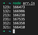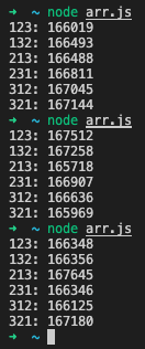 그리고, 각각의 경우의 수의 카운트는 array.join('') 함수와 count ["321"]++처럼 그 경우의 수의 숫자를 하나씩 증가하는 로직을 썼습니다.