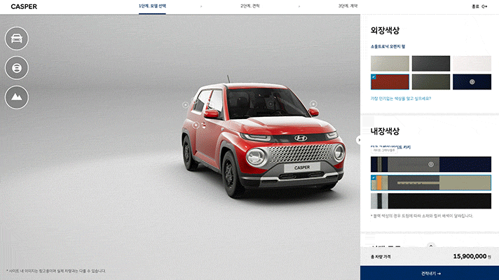 캐스퍼의 3개 트림 가운데 원하는 트림을 결정하고 내외장색과 선택 품목을 자유롭게 고를 수 있으며, 이에 따라 캐스퍼의 3D 디지털 체험 화면이 실시간으로 바뀌어 내가 구성한 차를 즉각적으로 확인할 수 있다.