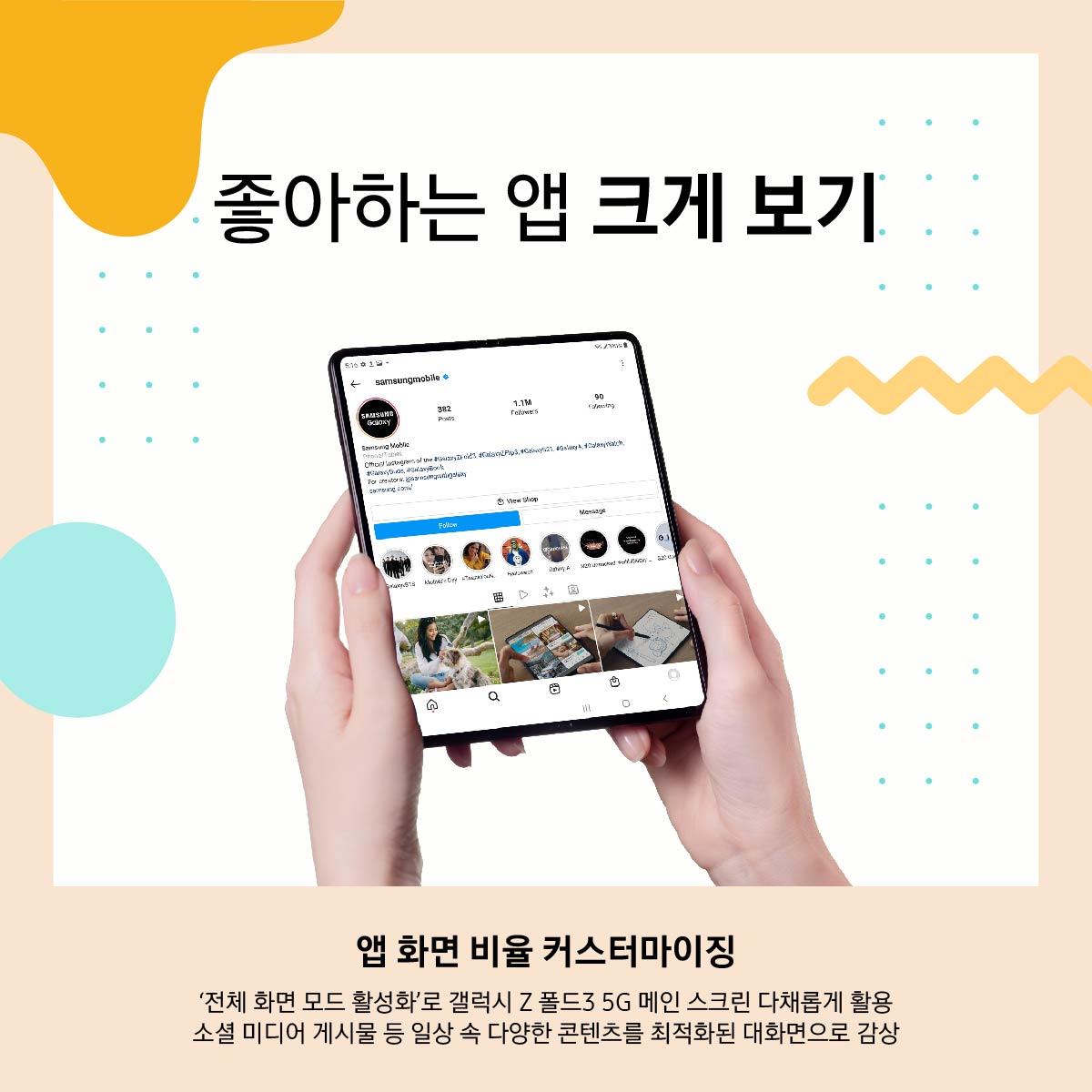 즐겨 쓰는 앱을 폴더블 디스플레이에 맞게 최적화하는 것은 물론, 앱 화면 비율 직접 설정과 앱 레이아웃 조정까지 자유자재로 가능하다.