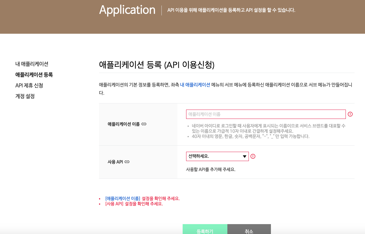 이 글은 튜토리얼이니까 첫 화면 애플리케이션 등록 화면으로 가서 처음부터 알아 볼까요?