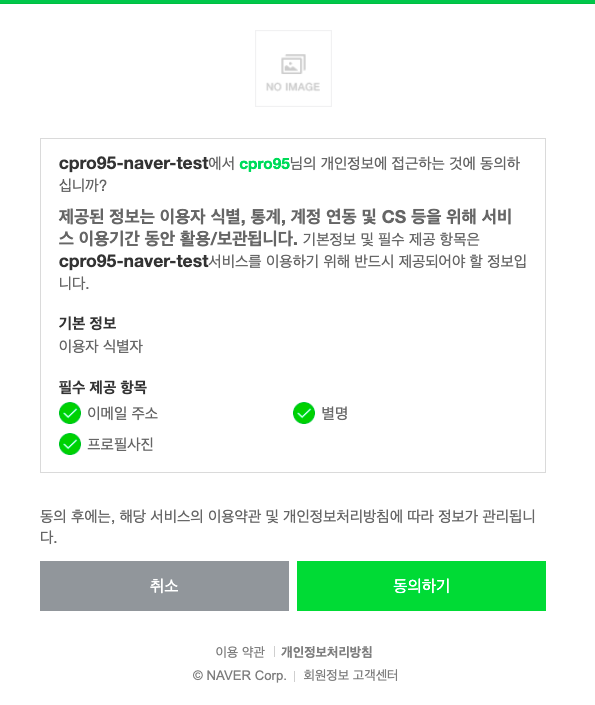 역시나 우리가 네이버 디벨로퍼에서 동의화면에서 선택한 세가지 즉, 이메일 주소, 별명, 프로필 사진이 필수 제공항목으로 나열되었습니다.